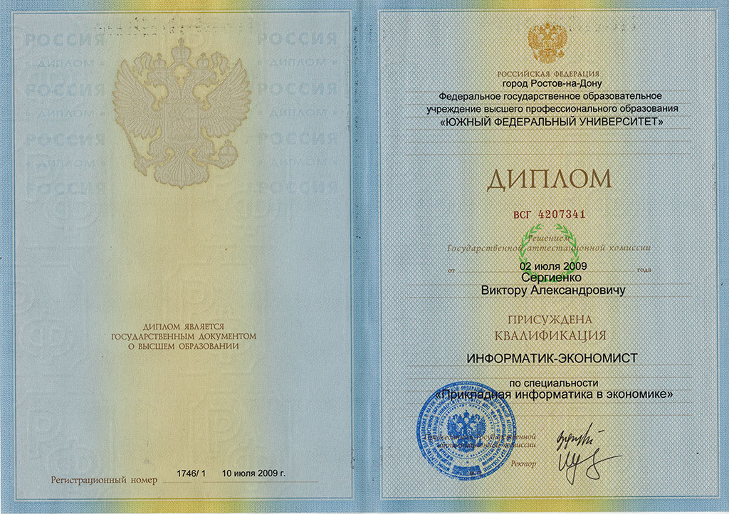 - ФГОУВПО «Южный Федеральный Университет» по специальности Прикладная информатика в экономике».